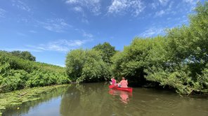 Ein Paar genießt die Kanutour auf der sich durch dichte Bewuchs schlängelnden Wümme Ob mit Kanu, Kajak oder SUP - eine Paddeltour auf der Wümme ist ein Erlebnis. Der Fluss schlängelt sich wunderschön durch die flache norddeutsche Landschaft.