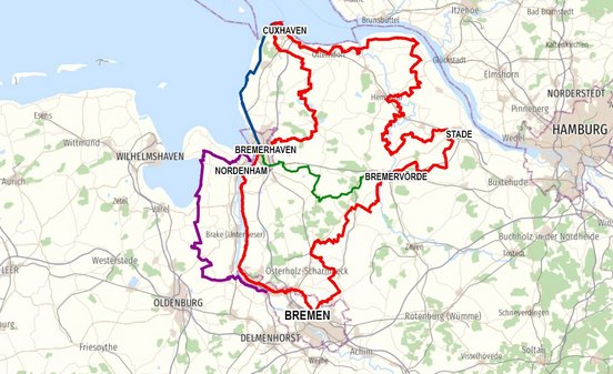 Bremerhaven – 17,5 km – Dedesdorf – 10 km – Sandstedt – 12,5 km – Rade – 10 km– Blumenthal – 13 km – Burglesum – 18,5 km – Bremen