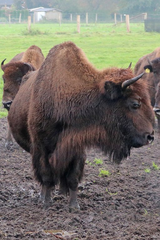 Aufgrund des Regens sahen die Tiere etwas bedröppelt aus, auch wenn Kälte für sie bis -40 Grad Celsius angenehm ist. Schade für die Fotos, aber "da kannste nix machen". Das sonst so flauschige Fell matschte an den massigen Körpern, die allerdings weniger massig waren als ich erwartet hatte. Eine Bison-Kuh kommt auf etwa 500-600 Kilo, ein Bison-Bulle gerne auch auf eine Tonne. Dass Limousin-Rinder noch schwerer sind, hat mich doch überrascht. Die sind aber wohl nicht so schnell - Vorteil fürs Bison. In der Weite der Prärie können Bisons rund zwei Stunden lang in einem Tempo von 50 kmh laufen, unter ihrem Buckel haben sie eine große Lunge. Da macht ein Gepard schon lange schlapp. In Boitzen ist natürlich am gut gesicherten Zaun Schluss. Weil Tiere allgemein aber selten aus Jux rennen, sondern in der Regel weil sie jagen (was bei Bisons entfällt) oder flüchten, ist eine ganze Prärie-Landschaft auch gar nicht nötig für das Wohlbefinden. Hauptsache, es kommt immer reichlich Futter, wenn es auf den Wiesen zu wenig wird.