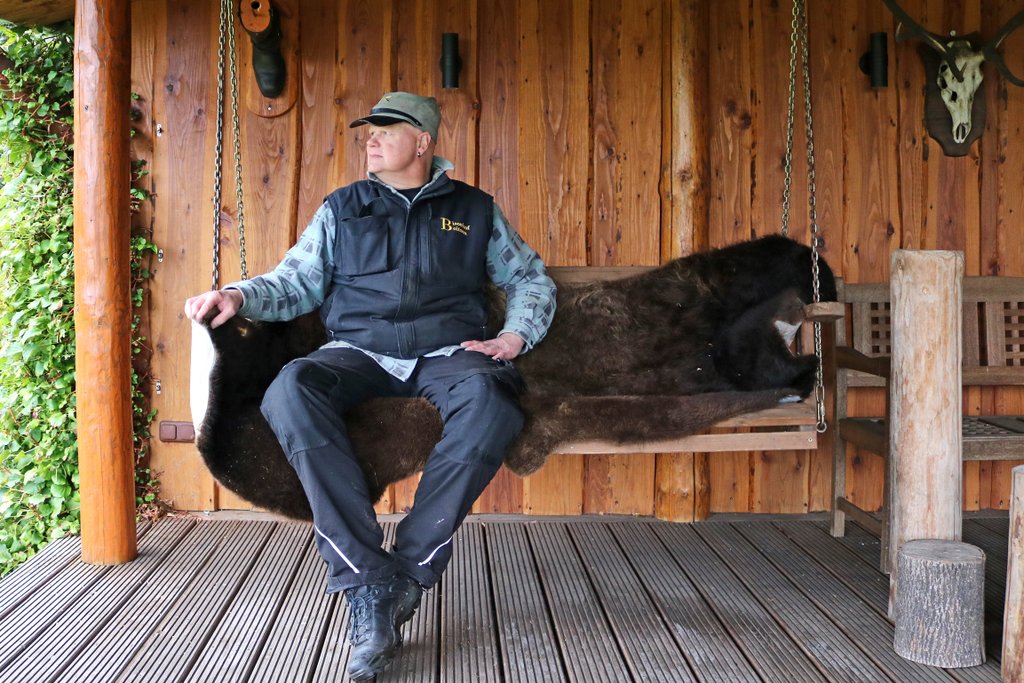 Wer bei Cord zu Besuch ist merkt schnell, dass er ein Herz für Amerika hat: Überall findest du Deko-Elemente, die keinen Zweifel daran lassen. Im hinteren Bereich gibt es eine Veranda mit Grill und Hängebank und viel Platz fürs Barbeque. Von der Bank aus kann er seine Herde beobachten, das ist richtig klasse. Diese Veranda ist der Lieblingsplatz von Cord, und das kann ich gut verstehen. Und damit es schön warm ist, liegen natürlich auch Felle bereit.