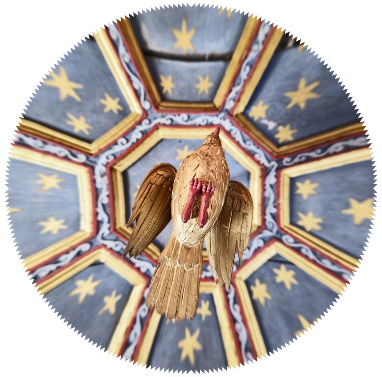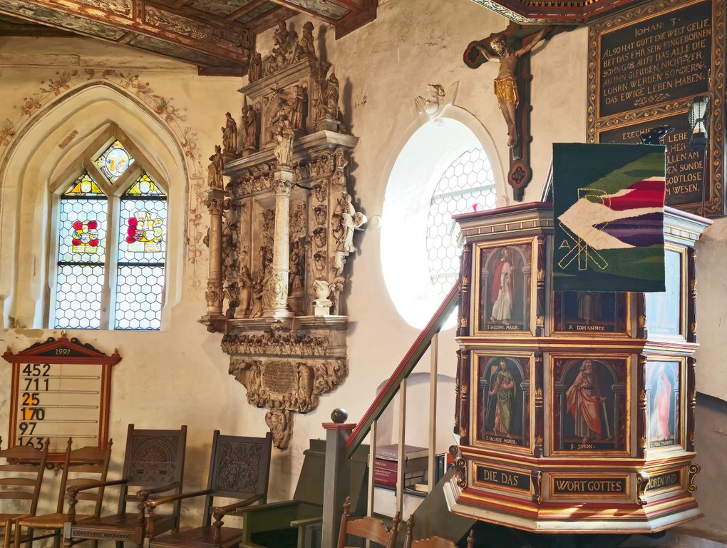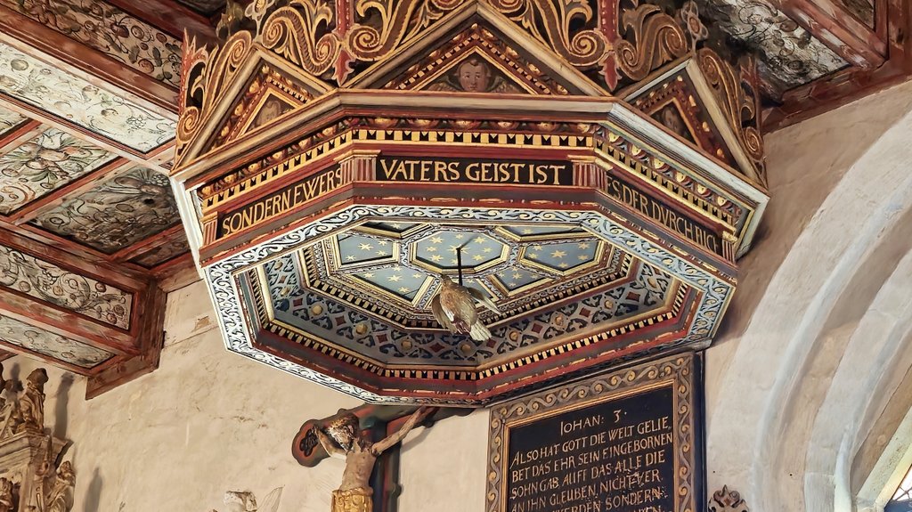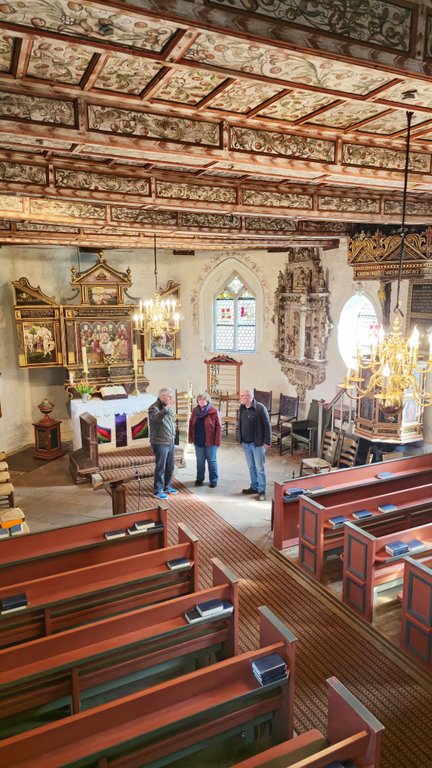 Die Kanzel wurde vom gleichen Künstler bemalt wie der Altar. Über dem Pastor schwebt eine Taube, ein Symbol des Heiligen Geistes. Ich durfte auf die Kanzel und die Ansicht des Pastors oder der Pastorin einnehmen. Automatisch wollte ich vorsichtshalber meinen Kopf bedecken, als Schutz vor - du weißt schon …