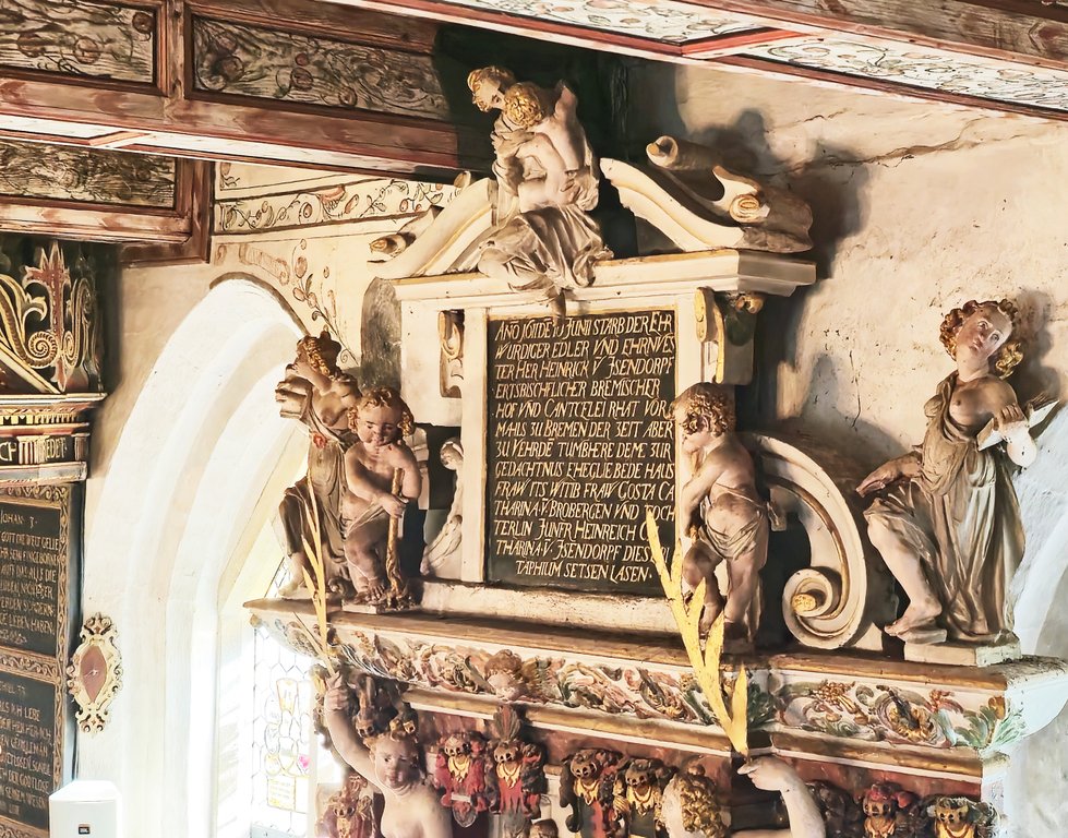 Christopher von Issendorff hat anno 1575-1578 die Kirche bauen lassen. Nur drei Jahre brauchte es wohl vom Baubeginn bis zur Inbetriebnahme. Er war „Ritter ohne Helm“, wenn man so möchte. Auf dem Grabstein siehst du ihn jedenfalls so. Die von Issendorffs waren lange im Dienst bei den Bremer Erzbischöfen, was auch den Bremer Schlüssel in einem der Fenster erklärt. Sie gelangten vom 13. bis ins 16. Jahrhundert im heutigen Elber-Weser-Dreieck zu Ansehen und Reichtum. Dem ersten Gutshaus in Poggemühlen - heute noch als Rittergut Poggemühlen erhalten - folgte bis 1500 das Dorf Oese. Christopher von Issendorff (Schreibweise auf dem Grabstein Christoffer und hier und da im Web Christoph, bitte nicht wundern, ist einfach so) wurde 1529 geboren, hatte 13 Kinder von zwei Frauen und neben vielen Kindern auch viel Geld, da er aufgrund des Todes seiner beiden Brüder alles erbte. Der fromme Edelmann ließ daher für sich, seine Familie und die Dorfbewohner eine eigene Kirche bauen, die hier vorgestellte wunderschöne Dorfkirche in Oese. Dieser Hintergrund erklärt die Lage inmitten von Bäumen und weiten Feldern. Nicht, wie so oft, im Mittelpunkt eines Dorfes. Die „Gute Stube des Kirchenkreises Bremervörde-Zeven“ ist bekannt als eine der schönsten Kirchen im Elbe-Weser-Dreieck, denn sie wurde nie komplett zerstört. Vielleicht habe ich mich gleich so wohl dort gefühlt, weil ich in einer ebenso ländlich gelegenen Dorfkirche aus dem Jahr 1230 konfirmiert wurde.
