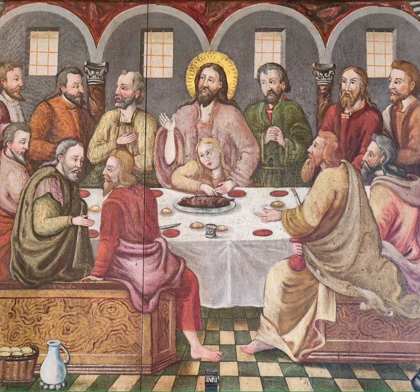 Im Web steht manchmal etwas von Brotkorb, aber es ist garantiert ein Lamm, was zu Ostern passt. In der Passionszeit wurde der Altar in früheren Zeiten zugeklappt, sodass nur noch der Herrgott darüber zu sehen war. Die Gemeinde fand es irgendwann aber eher blöd, gegen olle Holzplatten zu schauen. Seit einiger Zeit wird der Flügelaltar am Karfreitag geschlossen, und am Ostersonntag wieder aufgeklappt.
