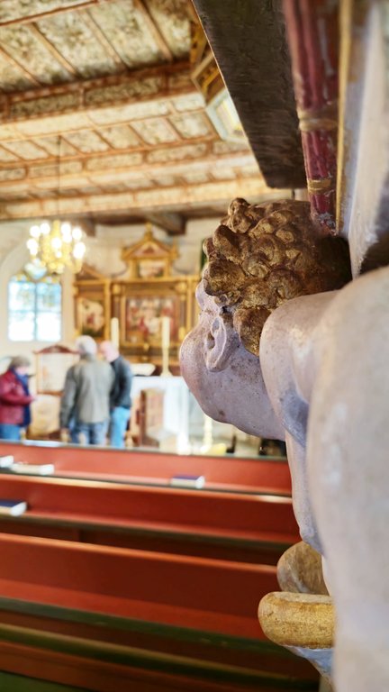 Die Holzdecke ist noch mit der originalen Bemalung versehen. Darauf sind ebenfalls 12 Engelsköpfe zu entdecken. Sie wirkt warm und fröhlich, mit Blumen und Ornamenten. Für mich persönlich ist die Decke das Highlight der Kirche.