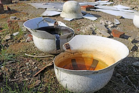 Auch die Helme und Ledersandalen sind überraschend. Diese stammen aus Zeiten des Gewerbegebiets, als hier ein Militaria-Händler sein Lager hatte. Mit den Kriegsgefangenen hat dies nichts zu tun.