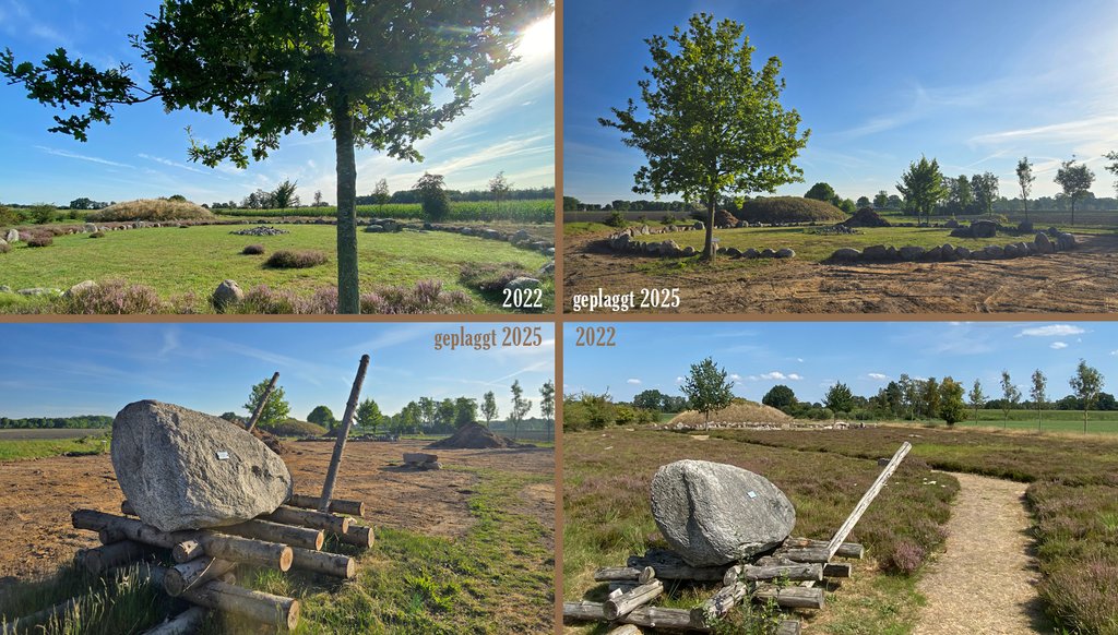 Im Mai 2025 musste die Fläche geplaggt werden. Es wird Jahre dauern, bis sich wieder das oben sichtbare schöne Bild der Heide ergibt. Dennoch sind die Gräber zugänglich, und auch der Pausenplatz kann weiterhin gerne genutzt werden.