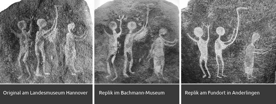 Rechts außerhalb des Landesmuseums in Hannover ist der originale Bildstein aus Anderlingen zu sehen. Denn das damals noch Provinzialmuseum Hannover genannte Haus leitete gleich im Januar 1908 die Ausgrabungen ein. Wegen des Frostes konnte nur ein begrenzter Bereich untersucht werden, aber schon im Oktober 1907, direkt nach dem Fund, sicherte ein Heimatforscher aus der Steinkiste ein Beil, eine Fibel und einen Dolch aus Bronze. Alle sichergestellten Gegenstände sind ins Landesmuseum in Hannover gelangt.