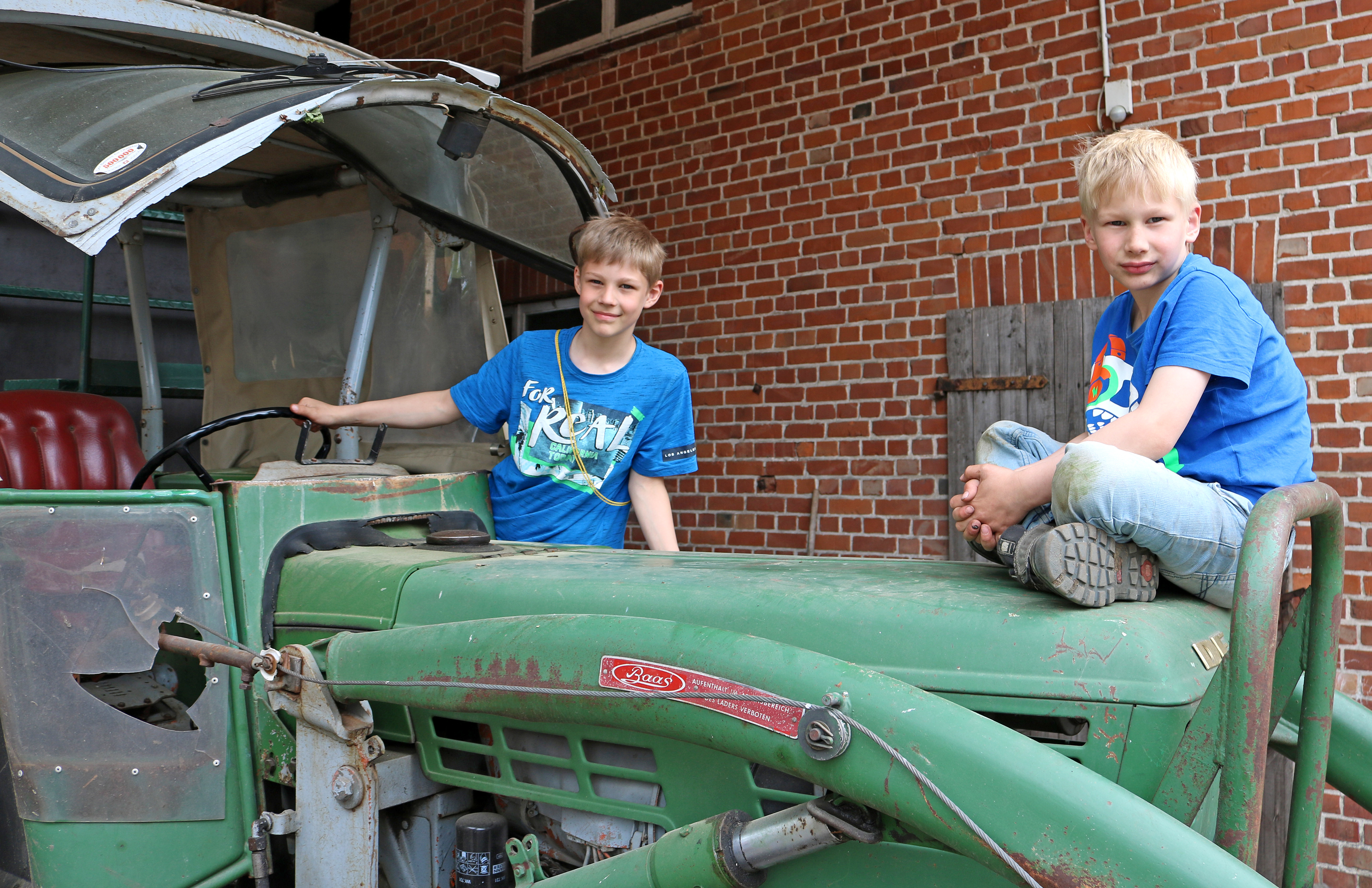 Dieser alte Trecker ist inzwischen ein Liebhaber-Stück. Ein Blick auf das Herstellungsjahr zeigt: Er und ich, wir sind ein Baujahr, ein kleiner Schock für mich. Ich hoffe nur, dass ich nicht ganz so historisch aussehe. Den direkten Vergleich bleibe ich dir lieber mal schuldig, und gebe dem Hof-Nachwuchs den Vortritt.