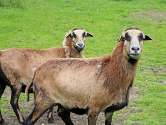 Wusstest du, dass Hühner eigentlich Urwald-Tiere sind? Einer der Urahnen der heutigen Hybride hat den Namen Bankivahuhn und lebt heute noch in Asien. Hühner lieben die Sonne, aber keine allzu heißen Temperaturen. Draußen sind sie leichte Beute für den Fuchs und für Greifvögel. Zu ihrem Schutz können sie sich jederzeit in den kühleren Mobilstall zurückziehen, zusätzlich leben je Weide aber auch zwei Kamerun-Schafe in einer Quasi-WG mit den Hühnern zusammen. Ursprünglich hatten diese Steppen-Tiere, die fast wie Ziegen aussehen, einen Rasenmäher-Job. Nun wurden sie umgeschult auf Bodyguard. Nachts kommen die Hühner aber weiterhin sicherheitshalber in den mobilen Stall.