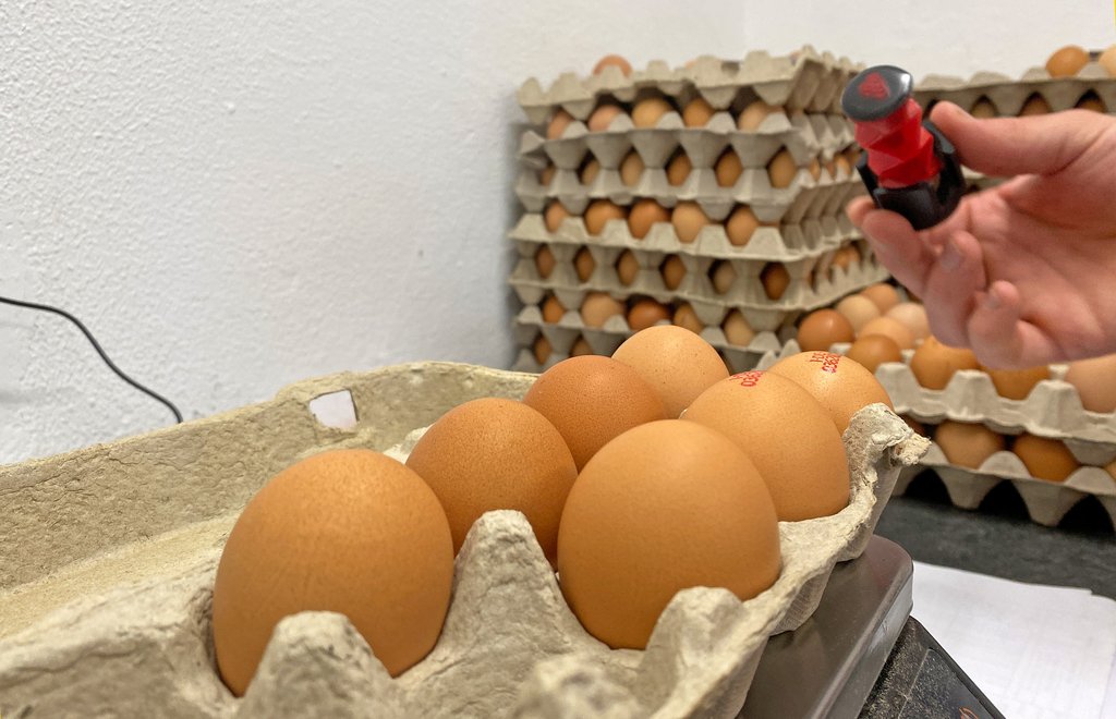 Die Eier werden täglich eingesammelt, sortiert und gestempelt. In einem Karton müssen immer mindestens 630 Gramm drin sein, so möchte es die deutsche Norm. Und aus den Stempeln lässt sich nicht nur die Haltung und der Betrieb, sondern auch das genaue Hühnermobil ablesen. Handarbeit und Transparenz sind gefragt.