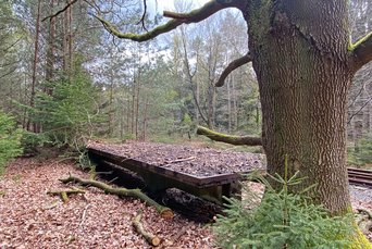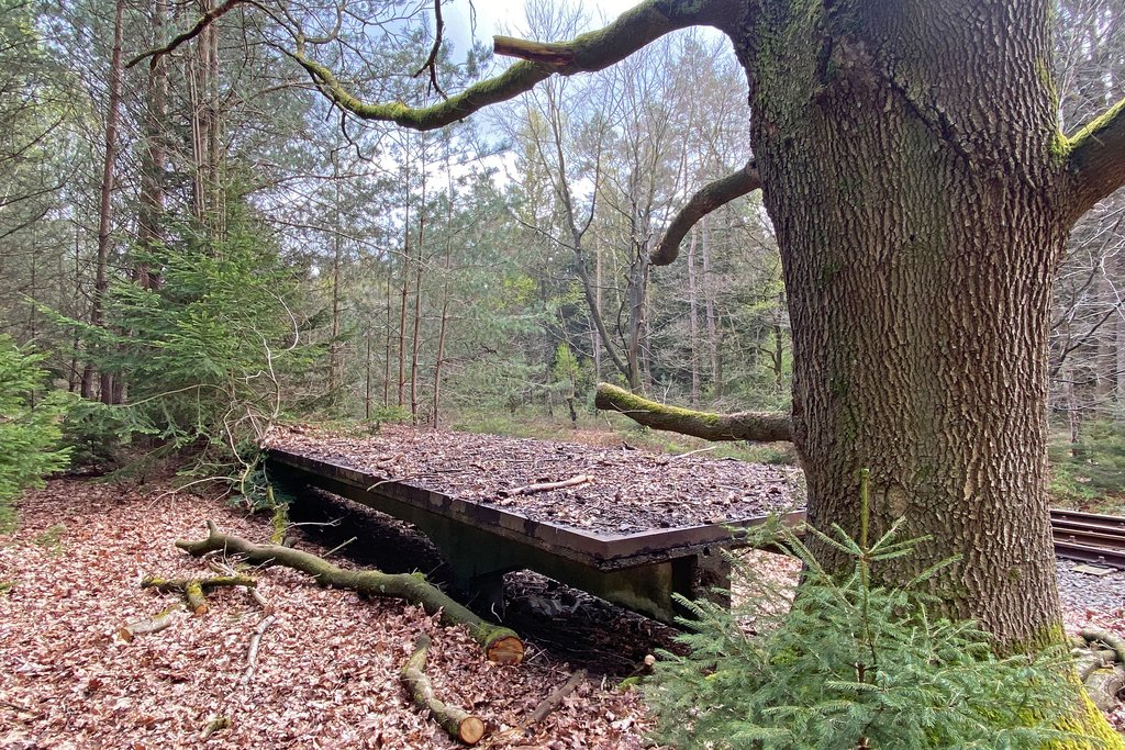 Die noch heute begehbare einige hundert Meter lange Verladerampe am Bahnhof, ein Stück weiter Richtung Wald, konnte damals nicht gesprengt werden. Von hier aus wurden Seeminen in die Kriegshäfen nach Bremerhaven und Cuxhaven befördert.