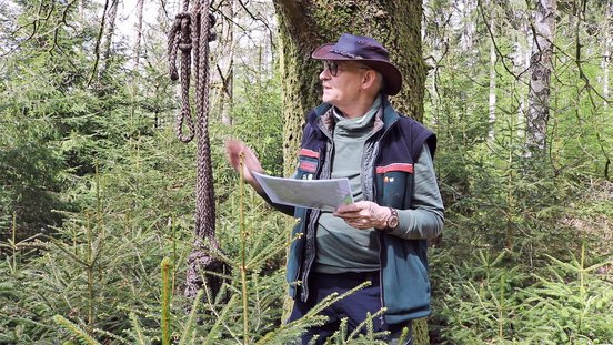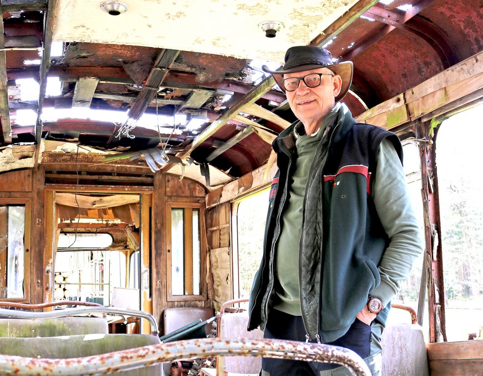 Jörn Freyenhagen erzählt gerne Geschichten über die Geschichte. Nicht fehlen darf dabei sein Markenzeichen, ein Hut aus Känguru-Leder, mit dem er spannende Erinnerungen an Australien verbindet. Der ehemalige Journalist war viel in der Welt unterwegs und hat über seine Reisen oft in der NDR-Sendereihe "Zwischen Hamburg und Haiti" berichtet. Nun ist er als Waldpädagoge viel in Wäldern der Region tätig. Im Hinzel hat er für das Waldpädagogikzentrum Elbe-Weser im Juli 2020 die öffentliche Führung rund um das Thema "Sperrzeugamt" übernommen. Und da Gäste beim ersten Namen "Bunker-Führung" dachten, es gäbe noch einige Bunker zu sehen, wurde daraus die "Lost-Places-Führung". Diese beginnt bei alten Straßenbahnen aus Bremerhaven, die am Bahnhof Heinschenwalde dem Verfall ausgeliefert sind.