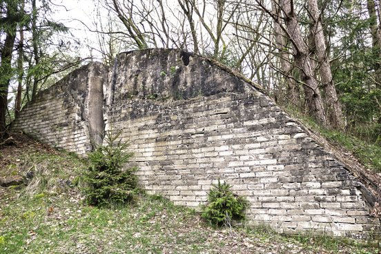 Die Bunker wurden nach dem Krieg gesprengt. Je 30 bis 50 Seeminen waren darin gelagert. Der Durchmesser lag bei 1,50 Meter, das Gewicht bei 1,15 Tonnen. Davon entfallen 450 Kilogramm auf den Sprengstoff. Diese Minen in den Bunkern sollten also gesprengt werden. Dafür wurden die Bunker erst geflutet. Nur einer, der wurde scheinbar zu früh gesprengt, oder etwas ist schiefgelaufen. Jedenfalls hat sich hier der Bunker teilweise erhalten, und so ist die große Bunkermauer das heutige Ziel der Führung.