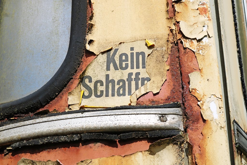 Diese Straßenbahn-Waggons haben Folgendes mit dem Sperrzeugamt zu tun: Nichts. Aber sie stehen an einer für die Geschichte wichtigen Stelle, und ein Lost Place sind sie auch. Das macht sie zu dem idealen Ausgangspunkt der Tour. Der Begriff "Ausgangspunkt" steht übrigens passend vorne am ersten Waggon. Natürlich ist es viel zu gefährlich, diese Wagen zu betreten. Die Reise in die Vergangenheit beginnt davor, mit Blick auf Jägermeister-Werbung.