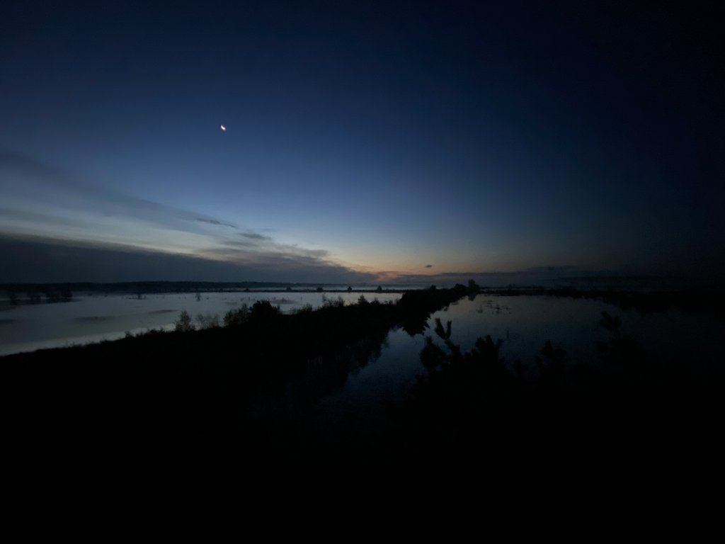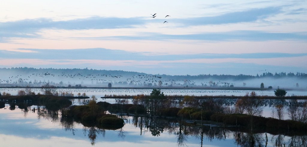 6 Uhr morgens, es war dunkel und kalt im Oktober. Mit der Taschenlampe und dick eingemummelt ging es durch das Moor. Kaum etwas war zu sehen, aber ich hörte erste Geräusche. Die Phantasie spielte mit mir, ein magischer Moment. An jenem Tag passte der ansonsten ungeliebte Spruch vom frühen Vogel, denn ich hörte das Ziel: Tausende von Kranichen und anderen Zugvögeln starteten mit großem Trompeten und Kreischen in den Tag.