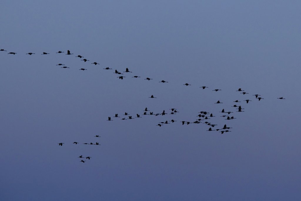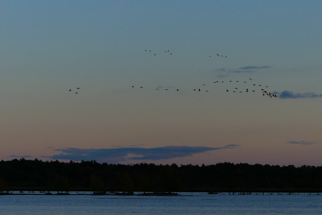 Viele Gänse waren dabei, das erkenne ich sogar als Laie. Und die Stars der Szenerie, die Kraniche. Mit ihrem Trompeten und den langen Hälsen waren sie auch am frühen Morgen gut auszumachen. Was für ein Radau!