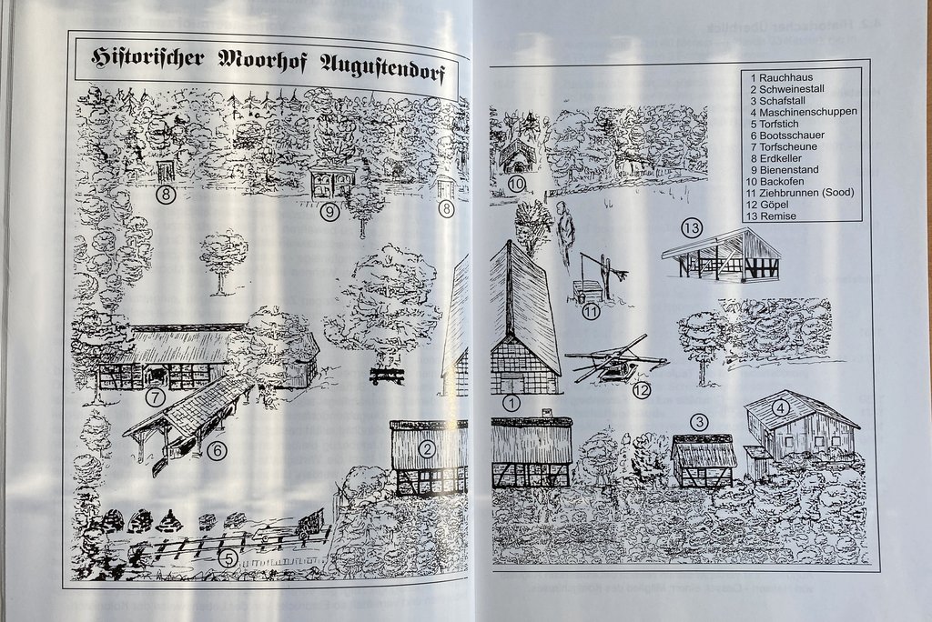 Nach und nach wurden die Gebäude restauriert, weitere wurden gebaut. Das Ensemble stellt so, wie es heute zu sehen ist, etwa den Stand von 1910 dar; das Jahr bezieht sich auf große Umbaumaßnahmen. Mein eigenes Haus wurde genau in diesem Jahr fertiggestellt, was für ein Zufall. Damals, ganz fortschrittlich, direkt mit WC. Dieses sucht man im Wohn- und Wirtschaftsgebäude in Augustendorf immer noch vergeblich, heute müssen Besucherinnen und Besucher dafür den ehemaligen Maschinenschuppen aufsuchen.