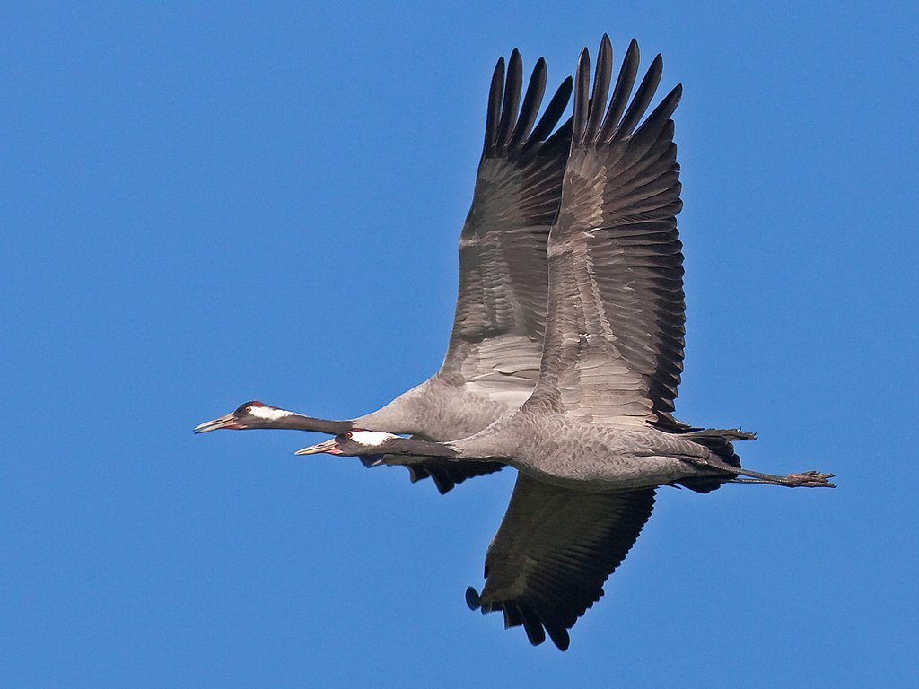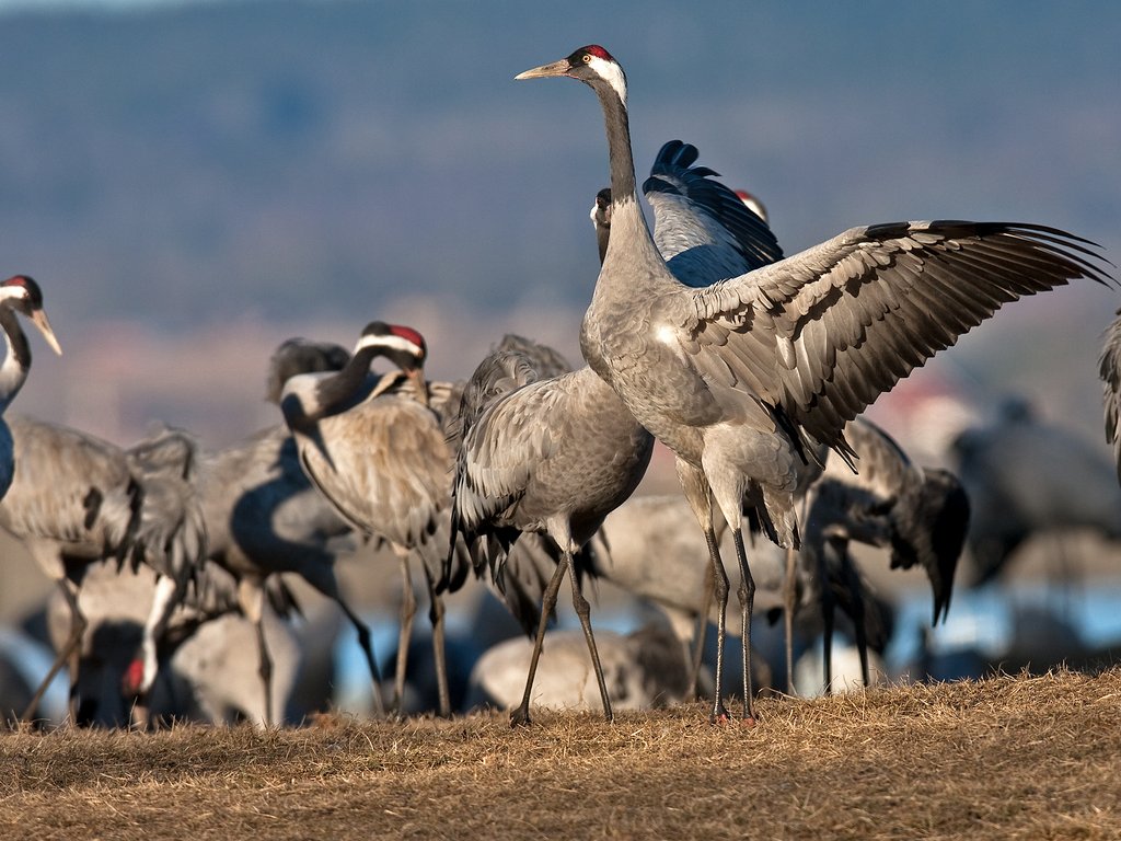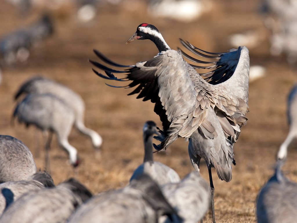 Was für ein Radau, wenn sich die Kraniche im Frühjahr und Herbst zu Tausenden treffen, auf ihrer langen Reise! Auf den Äckern ist der Tisch reich gedeckt, und in den Mooren können diese wunderbaren Tiere in den flachen Gewässern sicher übernachten. So tanken sie Energie, um sich im Frühjahr zu paaren und weiter nordwärts, Richtung Skandinavien, zu den Brutplätzen zu ziehen. Im Herbst geht es zurück zu den Überwinterungsplätzen im Süden.